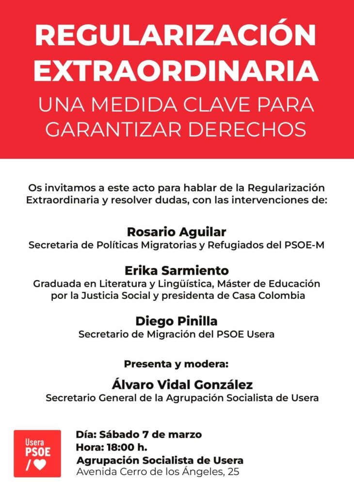Para hablar sobre esta medida, tan importante en un distrito como Usera, el sábado 7 de marzo, a las 18:00 horas, celebraremos en nuestra agrupación una charla/debate, en la que contaremos con Rosario Aguilar (Secretaria de Políticas Migratorias y Refugiados PSOE-M), Erika Castañeda (Presidenta Casa Colombia) y Diego Pinilla (Secretario de Migración PSOE Usera).